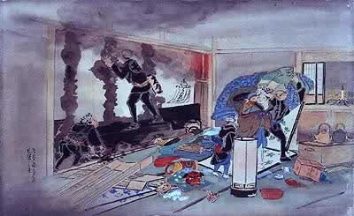 火事が近づくと,家財,貴重品などを土蔵に入れ,この絵のように,扉や窓を閉めて目塗りをして難をのがれたもので,こうしておくと土蔵に火が入らず,中の家財は焼残ることから,江戸の町民の火事に対する生活の智恵を画いたものである。この目塗に使う土は,日頃から土蔵の前に山盛りにして準備しておいたものである。土蔵造りは今日の耐火建物の元祖で,都市に大火の多かったこの時代に考え出された防火都市造り政策から奨励されたもので,この目塗りこそ大火に処する庶民の生活の智恵であろう。