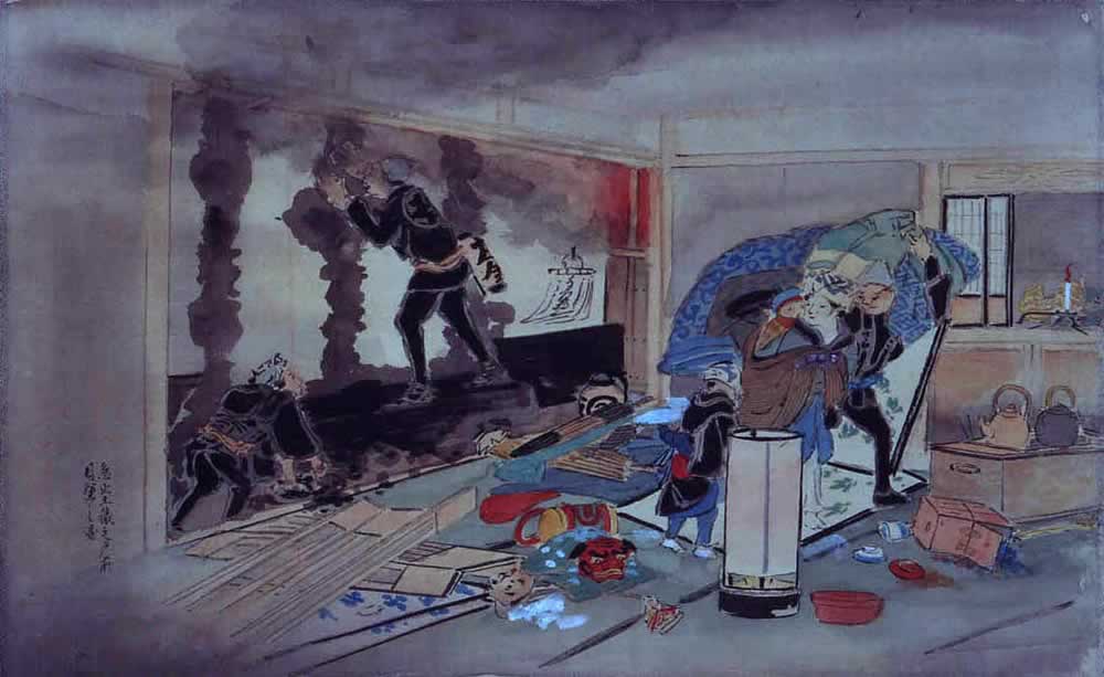 "江戸乃華"下巻の終りの2点は,火事もようやく収まった頃の様子を画いたもので,全21点は火事を発見して知らせる絵に始まる,江戸の火事の様子を一連の絵物語風に画いた作品である。この絵は,火事が収まり,焼跡の始末を始めたことを画いたもので,点々と見える札は〝消口〟をとった組の名を記した札で,鳶の者たちが早速板囲いや跡かたづけに精を出している様子が克明に画かれている。この絵のように,当時の火消たちは火を消すだけでなく,鎮火後も火事場の跡かたづけに働いたことがよくわかる。