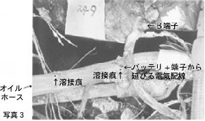 スターターB端子(写真3参照)に接続されている電気配線の接続金具の下面には,火災熱で溶けた状況とは明らかに異なる溶融痕がある。この直下のオイルホースにも直径1cmの溶融痕があり,合成ゴムも焼失している。この位置は接続金具の溶融痕の位置と一致するとともに,振動等の外力が働けば容易に接触することができる状況である。また,このオイルホースには,溶融痕からエンジン本体の約10cm反対側方向に同じ大きさの溶融痕があり,2箇所の溶融痕は,接続金具と同じで二次的な火災熱で溶けた状況とは明らかに異なる。