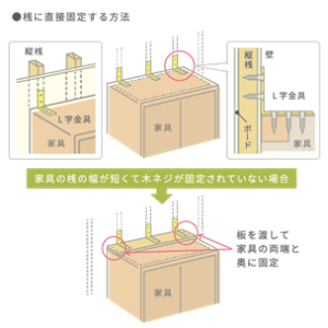問題のイラストの器具(L字(L型)金具)を使用する場合、固定場所は柱や鴨居、壁の中の桟(さん)を探し出し、金具と木ネジなどで固定します。壁に固定する場合、桟(さん)以外のところに固定すると、地震の時に家具の重さで壁が崩れてしまう恐れがあります。