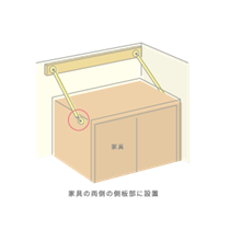(2)のような場合、ベルト・チェーン等で固定します。この場合、家具の側面に30゜以下の角度でピーンと張ります。たるみがあると効果は出ません。